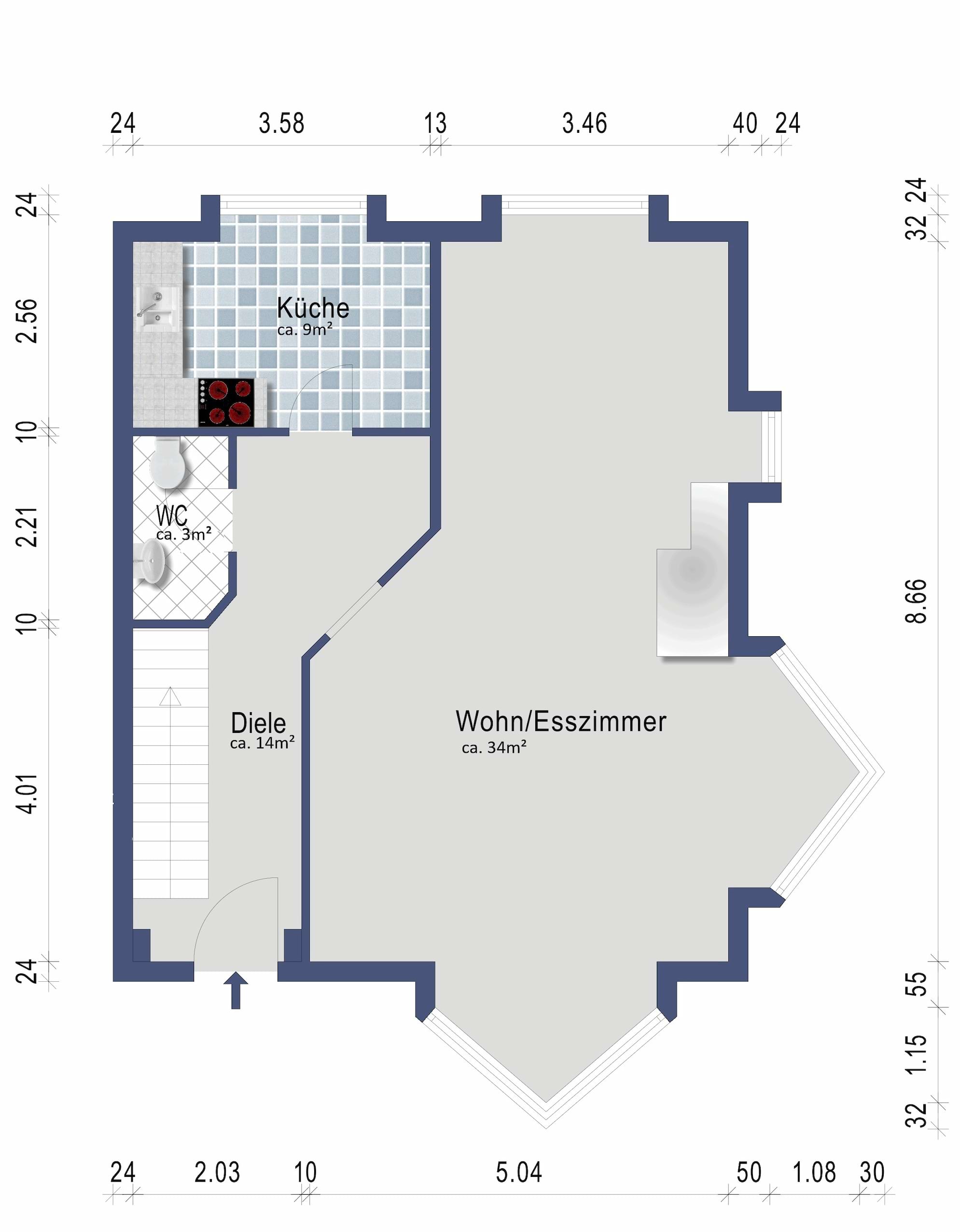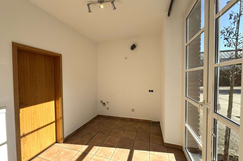 Im Erdgeschoss befindet sich ebenfalls die Küche und ein Gäste- WC. Der Boden wurde in terrakottafarbenen Fliesen ausgestattet.