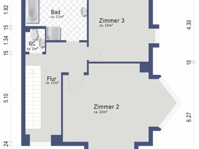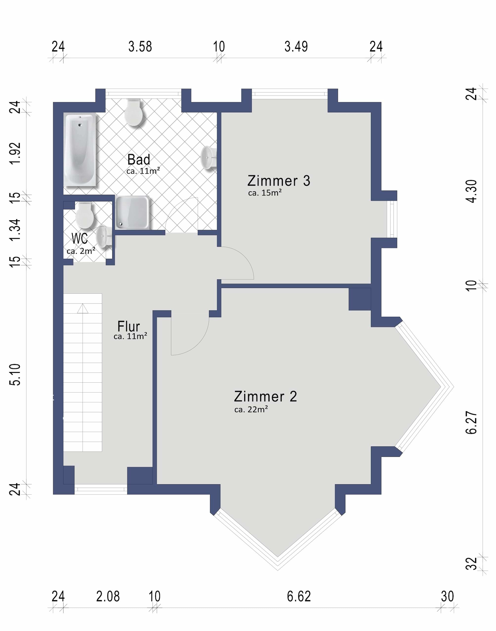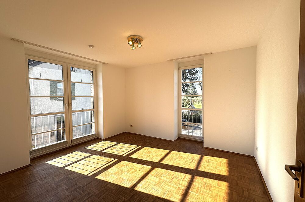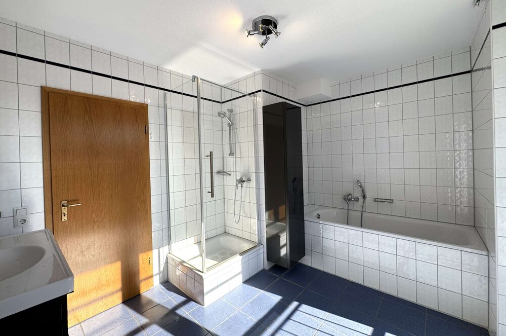 Das Badezimmer im Obergeschoss ist zeitlos hell gefliest und mit einer Dusche und Badewanne versehen. Auch hier sorgt ein großes bodentiefes Fenster für viel Tageslicht. Zudem gibt es hier ein separates WC. Im Obergeschoss befinden sich zwei schöne große Zimmer die als Schlaf-, Kinderzimmer oder Homeoffice genutzt zu werden können.