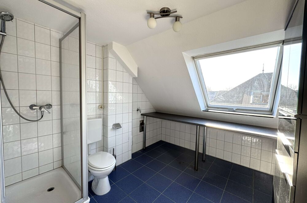 Vom Dachgeschoss aus hat man einen herrlichen Blick ins Grüne und in die umliegende Landschaft.Durch die großen umliegenden Fenster fällt viel Licht in den Raum. Hier im Dachgeschoss gibt es ein voll ausgestattetes Badezimmer mit Dusche sowie ein Anschluss für die Waschmaschine.