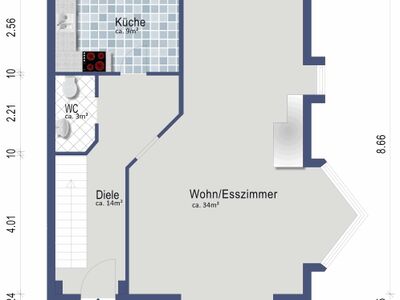 Dieses Haus erstreckt sich über drei Etagen. Im Erdgeschoss befindet sich ein schönes großes Wohnzimmer mit angrenzendem Essbereich. Besonders charmant ist, dass die Wohnung große bodentiefe Fenster mit Erker vorweist. Ein Kamin sorgt an ungemütlichen Jahreszeiten für kuschelige Atmosphäre.