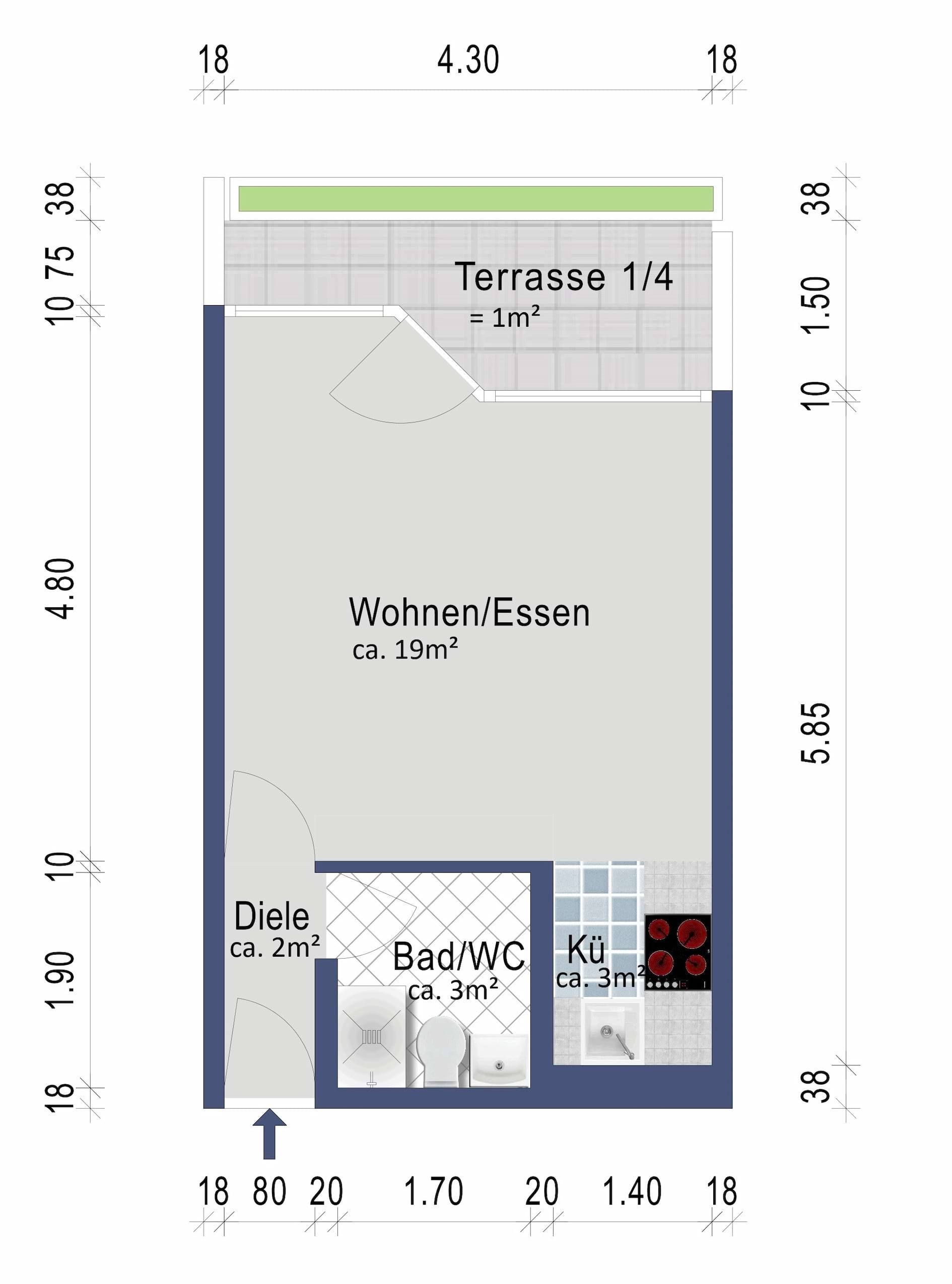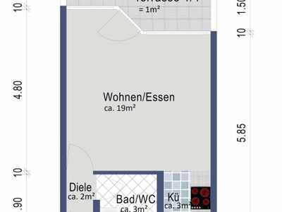 Die Wohnung teilt sich auf in einen großen Wohn- und Schlafbereich mit angrenzendem Balkon und einer Kochnische.