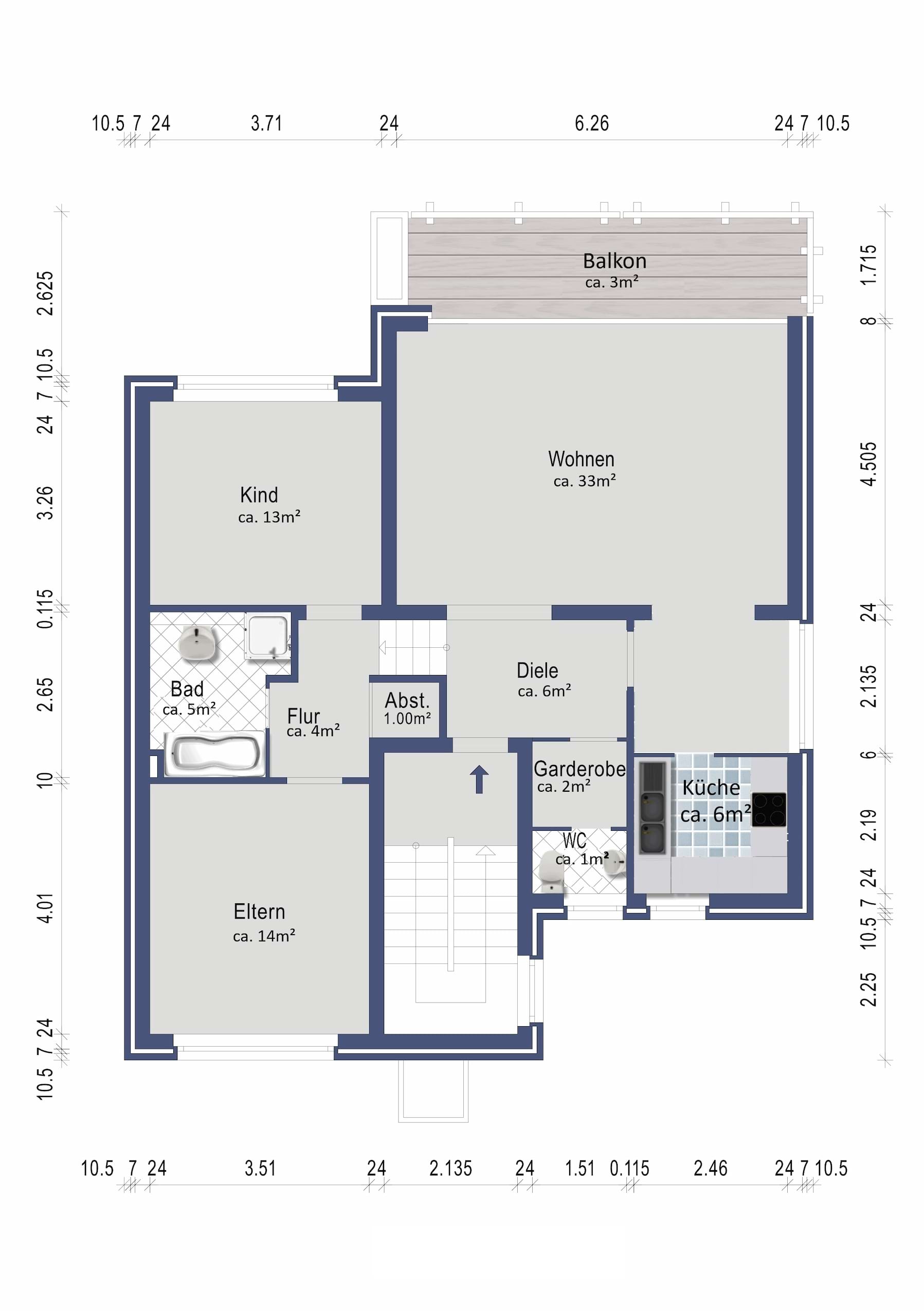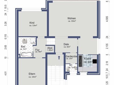 Vom Eingangsbereich aus betritt man über eine zentrale Diele die Wohnung. Von dort aus gelangt man in alle Räumlichkeiten der Wohneinheit.