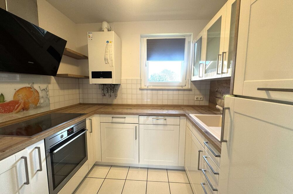 Das Wohnzimmer ist L-Förmig und bietet direkten Zugang in die Küche. Diese ist mit einer dem Alter entsprechenden hellen und gepflegten Einbauküche inkl. funktionsfähigen Elektrogeräten ausgestattet.