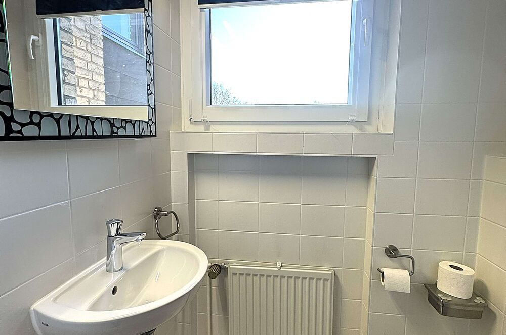 Angrenzend befindet sich das WC mit Waschbecken und Tageslichtfenster. Eine Garderobe ist ebenfalls vorhanden.