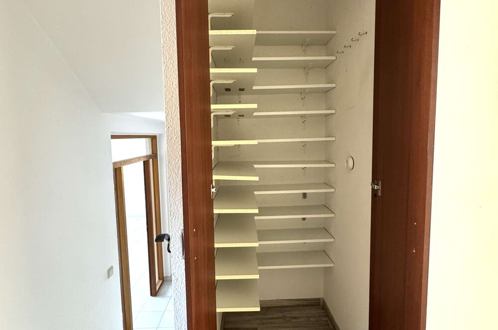Hier sind zwei Schlafzimmer und das innenliegende Badezimmer, welches mit einer Dusche und einer Badewanne ausgestattet ist. Des Weiteren gibt es hier eine Abstellkammer. Diese bietet viel Platz für Haushaltsutensilien.